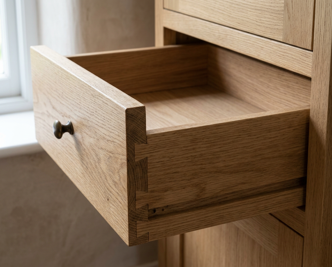 If you’re looking at drawers, dovetails are a good sign, especially if they’re clean and properly fitted. They’re not magic, but they usually show that somebody cared at least a little. If the drawer box is stapled together with thin material and a hardboard bottom, that’s telling you the opposite.