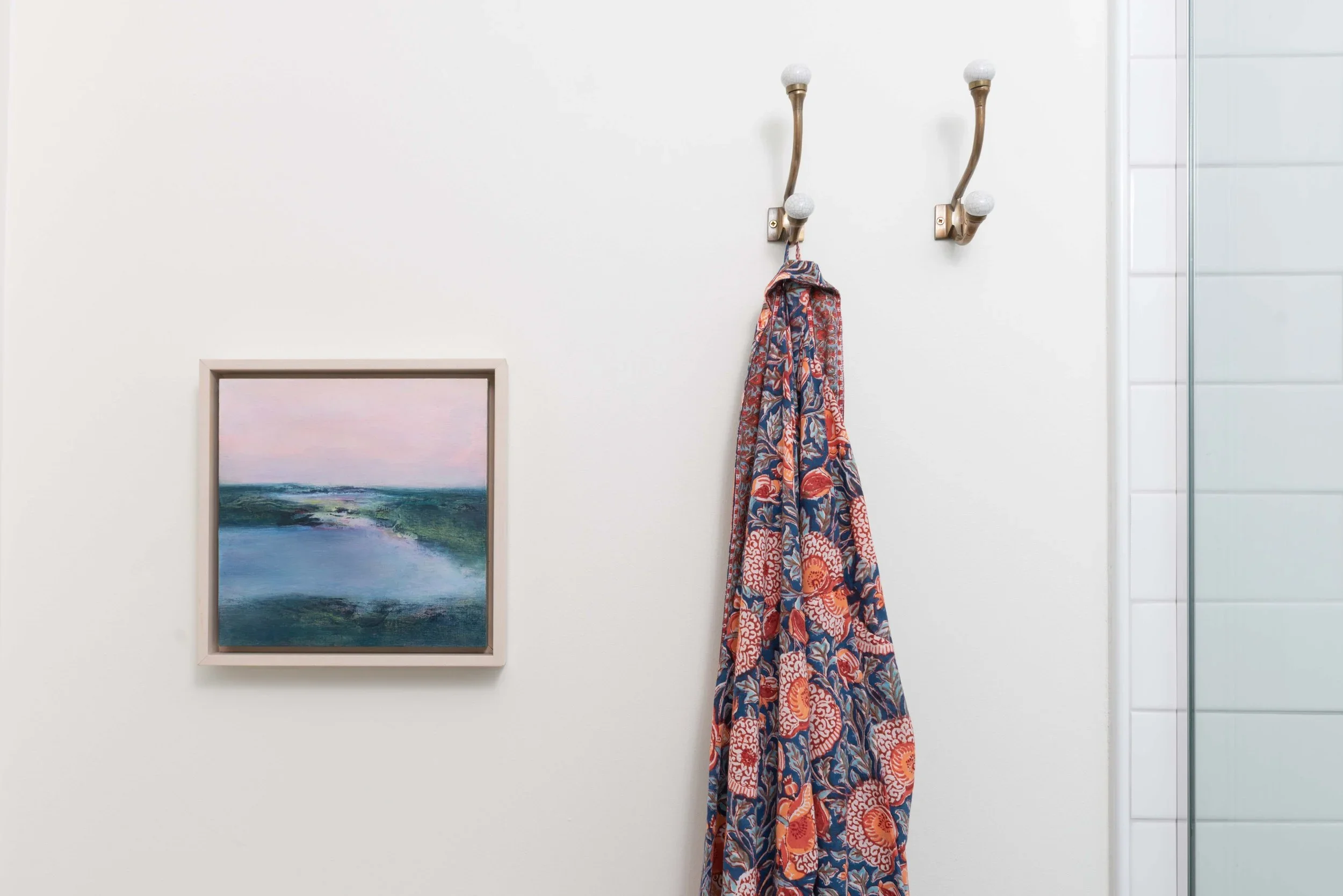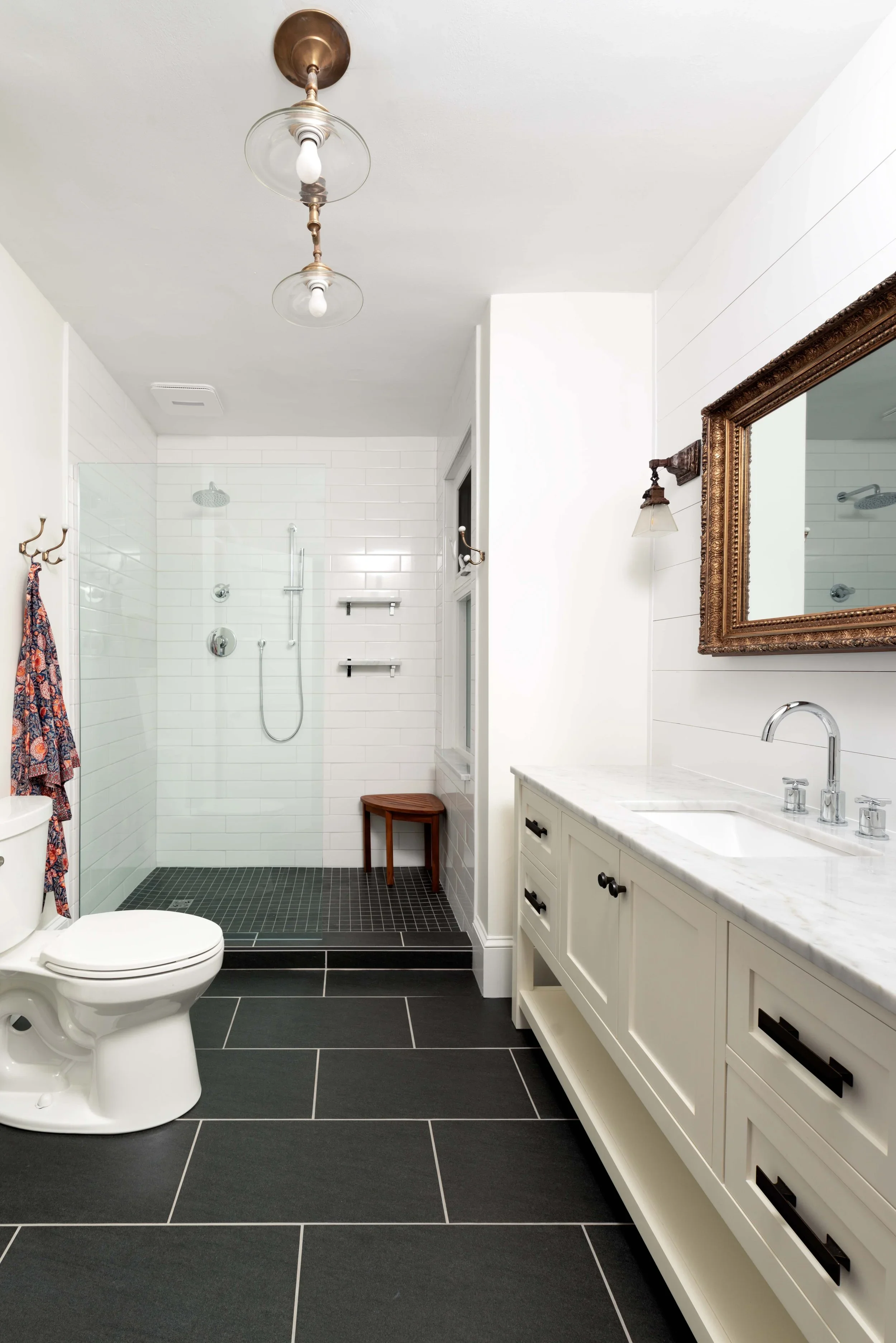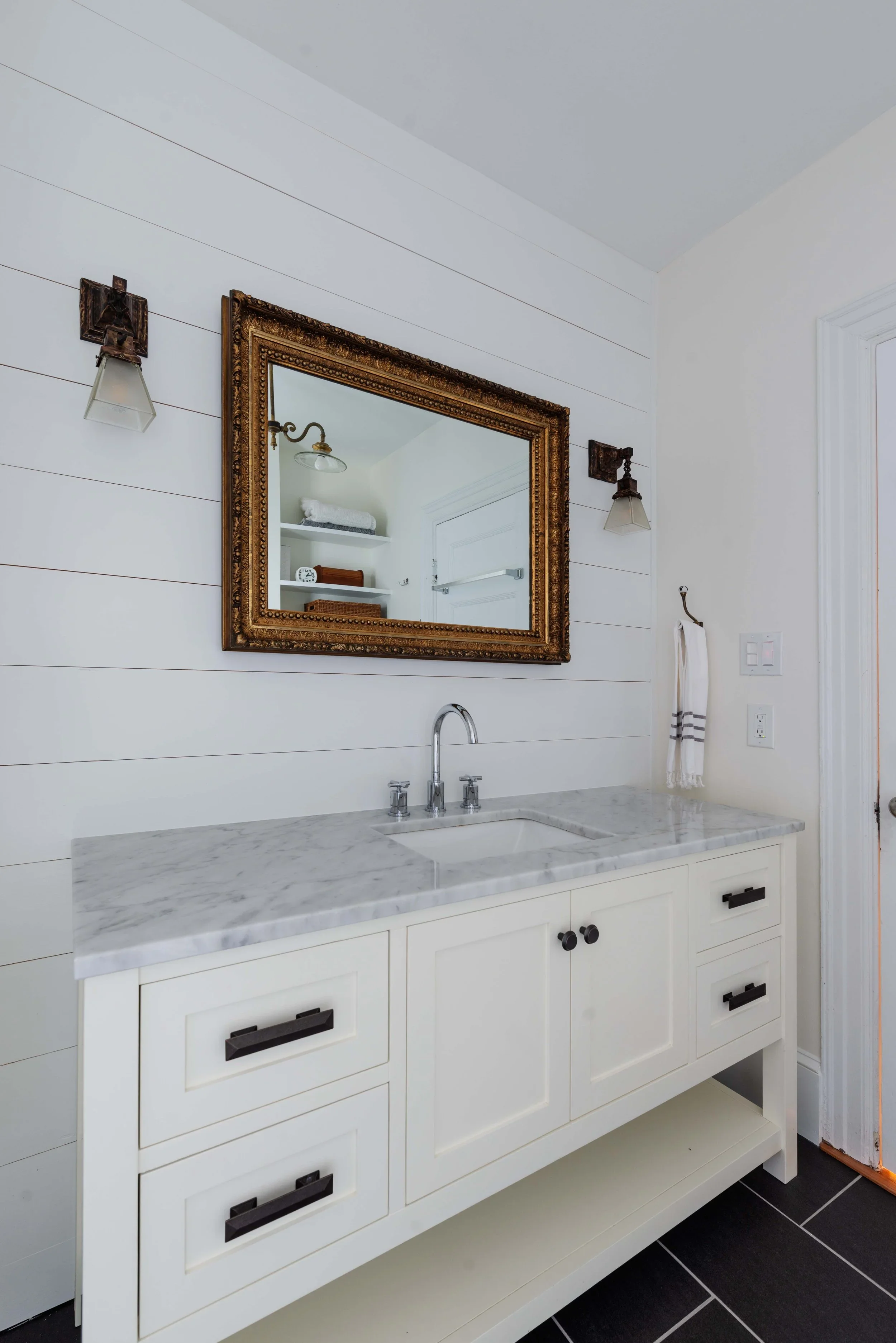 An antiquated bathroom needed an update to breath some fresh air into it. We started with a small corner shower, little storage space and outdated tile. To open it up we added a large one panel glass shower with contrasting floor and wall tile. A shiplap accent wall was added in the vanity area and extra storage behind the door in the form of custom built in shelves. To top it all off, radiant heating was installed bringing comfort and energy efficiency to this updated bathroom.